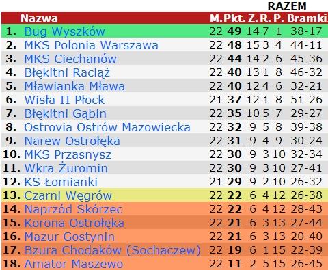 Po zmianie stron na boisku istnieli jedynie piłkarze z Wyszkowa. Pomimo całkowitej dominacji na boisku podopieczni trenera Ogrodzińskiego nie potrafili znaleźć lekarstwa na defensywę gości z Żuromina. Swoje sytuację zmarnowali, Kowalczyk, Matejuk czy Szydłowski. Gorąco zrobiło się pod koniec meczu, kiedy to Szydłowski (przyp. red. druga żółta kartka za przeszkadzanie bramkarzowi gości w wybiciu piłki) i Kaput (przyp. red. druga żółta karta za odkopnięcie piłki po gwizdku) zostali wyrzuceniu z boiska. Niestety liczna zgromadzona publiczność w Wyszkowie w tym dniu nie zobaczyła żadnej bramki. Remis Wyszkowian bardzo skomplikował ich sytuację ligową. Przewaga nad drugą w tabeli Polonią Warszawa (przyp. red. Polonia wygrała 2-1 z Błękitnymi Raciąż) zmalała do jednego punktu.