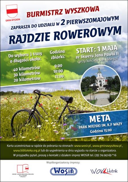 Burmistrz Wyszkowa po raz drugi zaprasza na pierwszomajowy przejazd rowerowy. Zbiórka tradycyjnie na skwerze Jana Pawła II przy kościele św. Idziego.