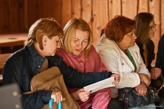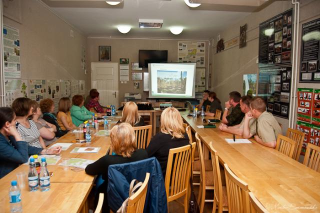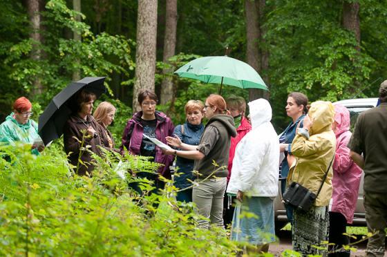 Podczas terenowej części warsztatów towarzyszył nam nieustannie padający deszcz. Nie przeszkadzało to jednak nauczycielom w nauce korzystania z mapy i innych leśnych "wskaźników położenia". Chwilą wytchnienia od deszczu była wizyta w punkcie obserwacyjnym wieży obserwacyjnej w Porządziu - miejscu, gdzie na monitorze komputera podczas dyżurów obserwuje się las, aby możliwe było jak najszybsze zauważenie sytuacji grożącej pożarem. W leśnictwie Tuchlin leśniczy Rafał Wyszyński powiedział jak pomagać ptakom, aby nie zaszkodzić samemu sobie. Tam również można było zapoznać się z pospolitymi, ale niebezpiecznymi dla zdrowia roślinami.