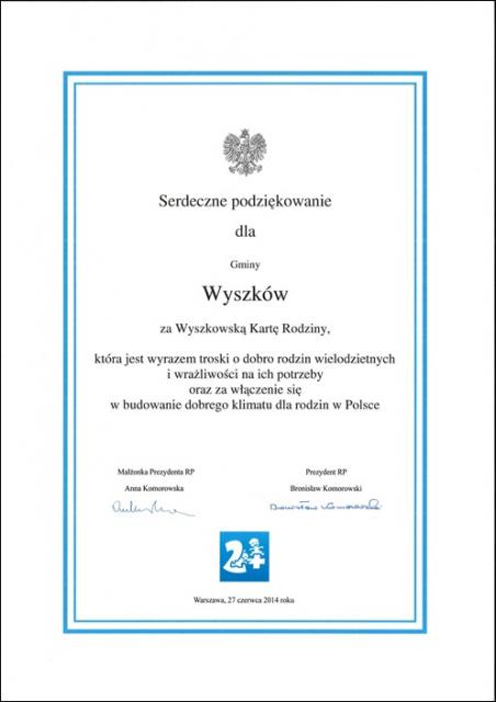 Burmistrz Wyszkowa Grzegorz Nowosielski odebrał osobiście w pałacu prezydenckim podziękowania dla Gminy Wyszków za wdrożenie programu Wyszkowska Karta Rodzina.