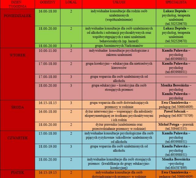 poniedziałek, wtorek, środa, piątek: od 16:00, czwartek :od 18:00 - indywidualne konsultacje dla osób stosujących przemoc- kwalifikacja do grup edukacyjno korekcyjnych