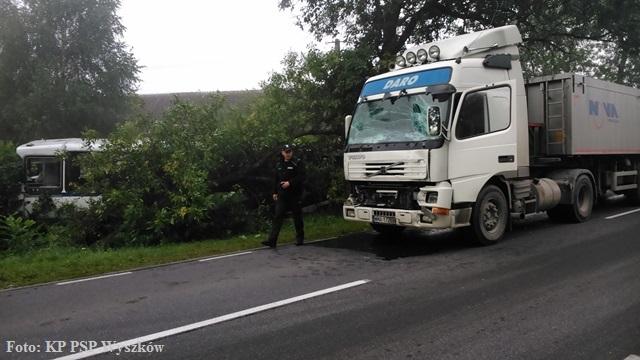 Na skutek zderzenia autobusu z samochodem ciężarowym do szpitala trafiły cztery osoby.
