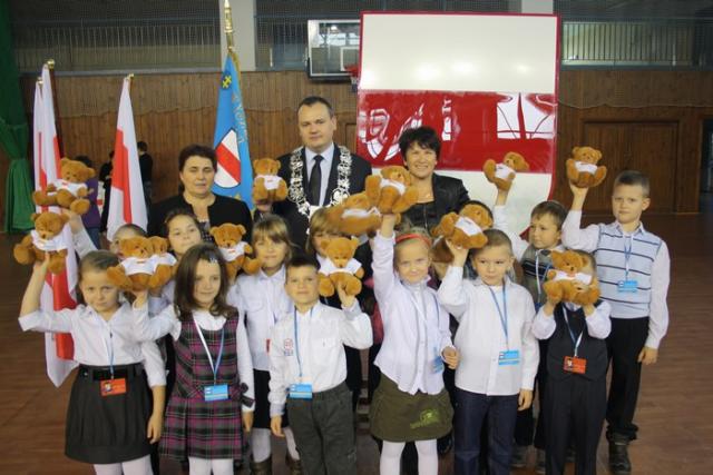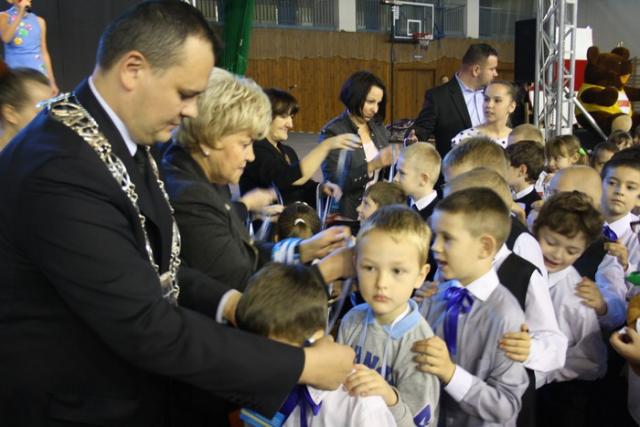 Oficjalnie w "rodzinie samorządowej" pierwszaków powitał burmistrz, Grzegorz Nowosielski. Życząc powodzenia w nauce i w życiu codziennym, wręczył "legitymację pierwszoklasisty". Każdy otrzymał również pluszową maskotkę z herbem Gminy Wyszków.