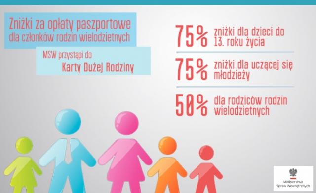 Ministerstwo Spraw Wewnętrznych od początku prac nad Kartą Dużej Rodziny aktywnie uczestniczy w działaniach wspierających rodziny wielodzietne. Do projektu ustawy przygotowanej przez Ministerstwo Pracy i Polityki Społecznej o Karcie Dużej Rodziny zgłosiło propozycję wprowadzenia ulg w opłatach paszportowych.