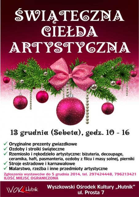 Oryginalne prezenty gwiazdkowe, rzemiosło i rękodzieło artystyczne - WOK "Hutnik" ponownie zaprasza na Świąteczną Giełdę Artystyczną.