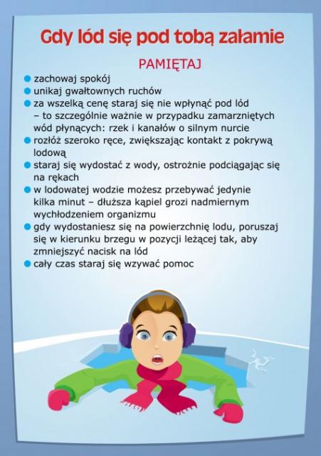 Policjanci w czasie spotkań z dziećmi przestrzegają przed wchodzeniem na zamarznięte zbiorniki wodne i przypominają podstawowe zasady postępowania w przypadku zagrożeń. Mundurowi podkreślają, że wystrzeganie się wchodzenia na zamarznięte wody i korzystanie tylko ze specjalnie przygotowanych i nadzorowanych lodowisk jest najbezpieczniejszą opcją korzystania z tej formy zimowych atrakcji.