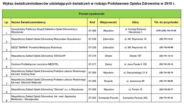 Sprawdź aktualny wykaz podmiotów leczniczych, które udzielają świadczeń lekarza POZ/pielęgniarki POZ/położnej Podstawowej Opieki Zdrowotnej na terenie powiatu wyszkowskiego.