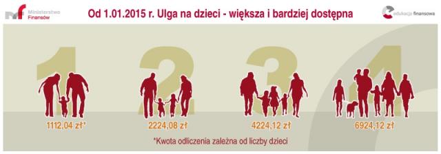 Na dodatkowe wsparcie w postaci zmienionej ulgi na dzieci będzie mógł liczyć ponad milion rodzin (ok. 1,8 mln podatników), w których wychowuje się ok. dwa miliony dzieci. Dzięki temu ponad 97 proc rodzin - płatników PIT - będzie mogło wykorzystać tę ulgę w pełni. Nastąpi też podwyższenie ulgi na trzecie i każde kolejne dziecko o 20 proc. To kontynuacja zmian z 2013 r., kiedy podwyższono ulgę na trzecie dziecko o 50 proc., a na czwarte i każde kolejne o 100 proc. Stąd już w 2015 r. kwoty odliczenia będą wynosić na pierwsze i drugie dziecko - 1.112,04 zł, na trzecie - 2.000,04 zł, a na każde kolejne 2.700 zł. Jest to związane z tym, że stopa ubóstwa jest najwyższa właśnie w rodzinach wielodzietnych i rośnie wraz z liczbą dzieci w rodzinie.