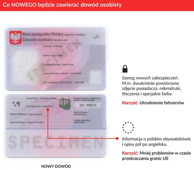 Pojawi się szereg nowych zabezpieczeń. M.in. dwukrotnie powtórzone zdjęcie posiadacza, mikrodruki, tłoczenia i specjalne farby. Dzięki temu znacznie trudniej będzie go sfałszować. Na dowodzie znajdą się też informacje o polskim obywatelstwie.