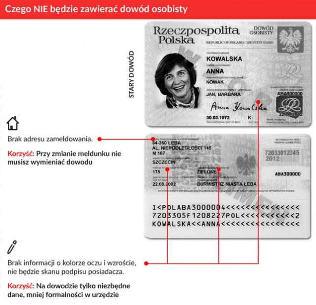 Zniknie adres zameldowania. Dzięki temu, przy każdej zmianie meldunku nie trzeba będzie wymieniać dowodu. Nie będzie także informacji o kolorze oczu i wzroście ani skanu podpisu posiadacza. Zrezygnowano z wszelkich danych, które nie są niezbędne albo polegają na subiektywnej ocenie obywatela lub urzędnika.
