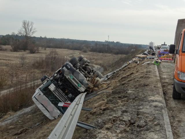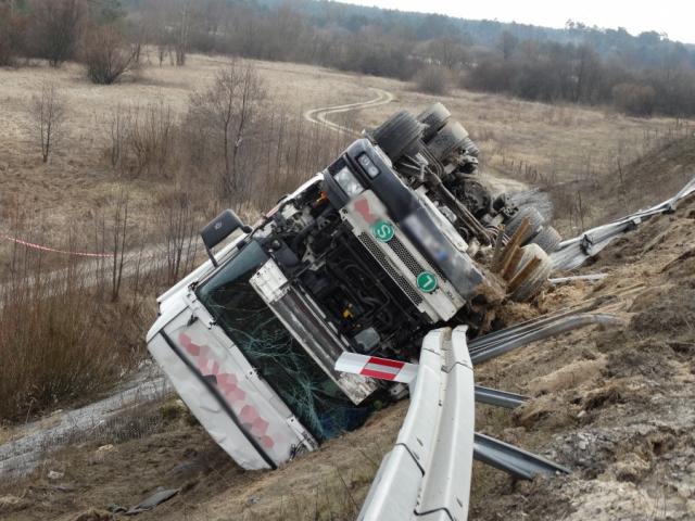 Wyszkowscy policjanci zabezpieczali miejsce zdarzenia drogowego. Na trasie S-8 w miejscowości Turzyn kierowca samochodu ciężarowego z około 10 tonowym ładunkiem zjechał z drogi i zsunął się kilkanaście metrów w dół skarpy.