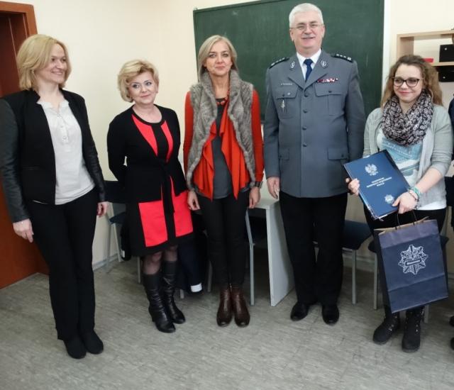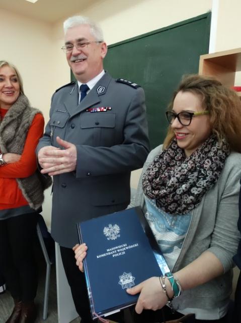 13 marca w obecności dyrektora szkoły, pedagoga, wychowawczyni i uczniów klasy do której uczęszcza Ania, Komendant Powiatowy Policji w Wyszkowie insp. Michał Toporkiewicz wręczył laureatce konkursu dyplom i nagrodę rzeczową.