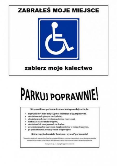 Zabrałeś moje miejsce - zabierz moje kalectwo - pod takim hasłem wyszkowscy policjanci, prowadzą dzisiaj działania w ramach Światowego Dnia Inwalidów i Ludzi Niepełnosprawnych.