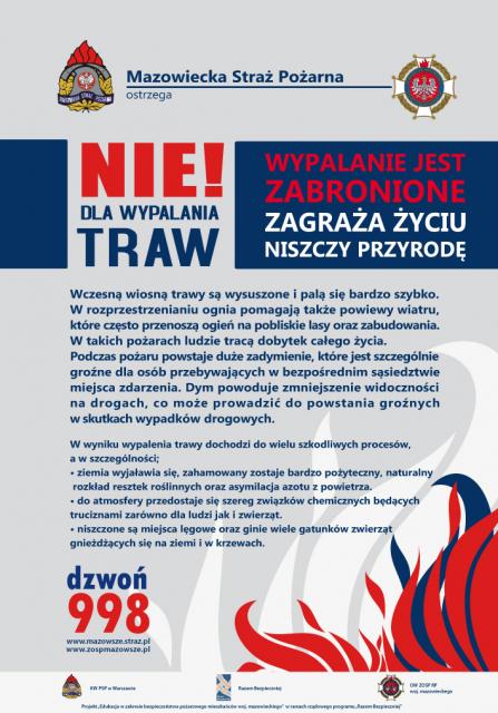 Każdego roku w okresie wiosennym powraca problem wypalania traw, które często jest przyczyną powstania dużego pożaru, obejmującego zabudowania i lasy.