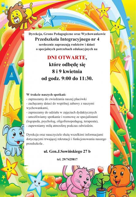 Dyrekcja, Grono Pedagogiczne oraz Wychowankowie Przedszkola Integracyjnego nr 4 serdecznie zapraszają rodziców i dzieci o specjalnych potrzebach edukacyjnych na Dni Otwarte.