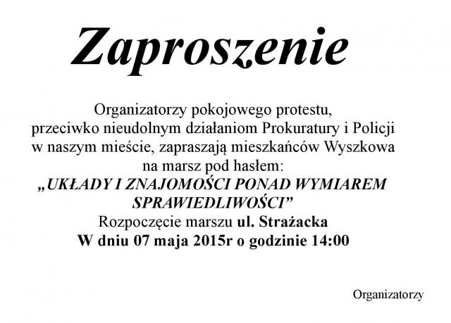 Organizatorzy pokojowego protestu, przeciwko nieudolnym działaniom Prokuratury i Policji w naszym mieście, zapraszają mieszkańców Wyszkowa na marsz pod hasłem "UKŁADY I ZNAJOMOŚCI PONAD WYMIAREM SPRAWIEDLIWOŚCI".