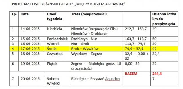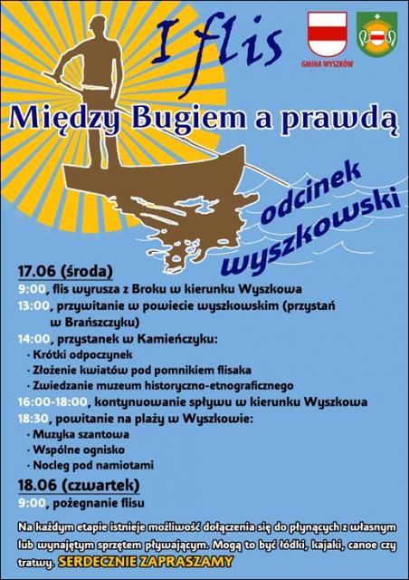 Już w środę, 17 czerwca uczestnicy flisu zawitają do powiatu wyszkowskiego. Wcześniej o godz. 9. wypłyną z miejscowości Brok, by ok. godz. 13. dobić na chwilę do przystani w Brańszczyku. Tu zostaną powitani przez przedstawicieli gospodarza miejscowości i reprezentanta Starostwa Powiatowego. Według wstępnych ustaleń wójt gminy Brańszczyk Mieczysław Pękul i wicestarosta Adam Mróz, bo o nich mowa, dołączą lokalną zabytkową łodzią typu pychówka do grupy ok. 30 uczestników i wszyscy razem bez przystanku udadzą się w kierunku Nakła. Pierwsze wodowanie flisu podczas środowego płynięcia będzie miało miejsce około godz. 14.00 w Kamieńczyku, gdzie uczestniczy zjedzą ciepły posiłek, złożą kwiaty pod pomnikiem flisaka oraz wysłuchają krótkiej prelekcji w muzeum etnograficznym Henryka Słowikowskiego. O godz. 16. wyprawa ruszy dalej w kierunku Wyszkowa. Spodziewana godzina przepłynięcia pod wyszkowskim mostem to 18:00-18:30. Na wyszkowskiej plaży wodniacy zostaną przywitani przez mieszkańców miasta. Plaża zapełni się namiotami oraz dźwiękiem muzyki szantowej. Zostanie rozpalone wspólne ognisko w którym będzie mógł uczestniczyć każdy chętny. Na śmiałków, którzy podjęli próbę przepłynięcie pięknej, ale zarazem niebezpiecznej rzeki Bug czeka nocleg w Wyszkowie pod gołym niebem. Flis w dalszą drogę w kierunku Warszawy i corocznego wydarzenia "Wianki Nad Wisłą" rozpocznie następnego dnia w czwartek ok. godz. 9.
