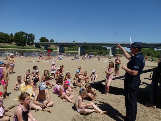 Upalne dni sprzyjają spędzaniu wolnego czasu nad wodą. Wyszkowscy policjanci o bezpieczeństwie nad wodą rozmawiali z dziećmi wypoczywającymi na plaży w Wyszkowie.