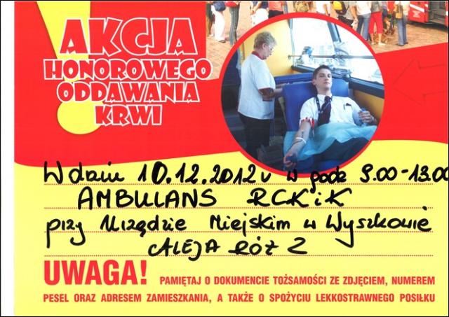 Już, w poniedziałek, 10 grudnia 2012 roku, każdy mieszkaniec Wyszkowa będzie mógł honorowo oddać krew. Akcja trwa od godziny 9.00 do 13.00.