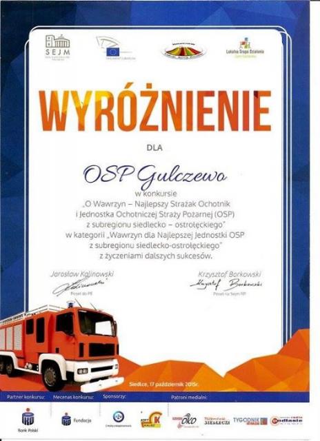 Jednostka Ochotniczej Straży Pożarnej w Gulczewie otrzymała wyróżnienie w konkursie: "O Wawrzyn dla Najlepszej Jednostki OSP i Najlepszego Strażaka Ochotnika z subregionu siedlecko - ostrołęckiego".