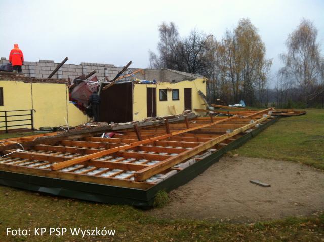 W miniony poniedziałek około godziny 12:30 do Stanowiska Kierowania Komendanta Powiatowego PSP w Wyszkowie wpłynęło zgłoszenie o zerwanym dachu na budynku mieszkalno-gospodarczym w Wyszkowie. Był to skutek silnych podmuchów wiatru, które występowały w dniach 08-09.11.2015r. na terenie Wyszkowa i okolic. Na miejsce zdarzenia zadysponowano zastępy GBA 4,5/16 oraz SHD 25 z JRG w Wyszkowie. Na miejsce zdarzenia przybył także zastępca dowódcy Jednostki Ratowniczo-Gaśniczej z Wyszkowa, przedstawiciel Ośrodka Pomocy Społecznej oraz przedstawiciel Urzędu Miasta. Po przeprowadzeniu oględzin Kierujący Działaniami Ratowniczymi zrelacjonował, iż dach został całkowicie zerwany z budynku i znajduje się na posesji przed wyżej wymienionym obiektem. Działaniem, jakie podjęto na miejscu było zabezpieczenie budynku, nad częścią mieszkalną i gospodarczą, plandeką zabezpieczającą przed opadami atmosferycznymi. Ponad to usunięto zagrażające, nadłamane belki oraz zabezpieczono stemplując naruszone ściany. O dalszej możliwości eksploatowania budynku decyzję musi podjąć rzeczoznawca z Nadzoru Budowlanego.