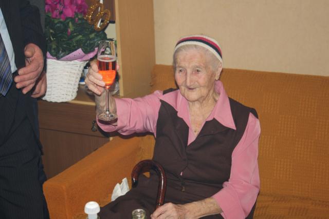 Swoje urodziny jubilatka uczciła lampką szampana oraz kawałkiem urodzinowego tortu.