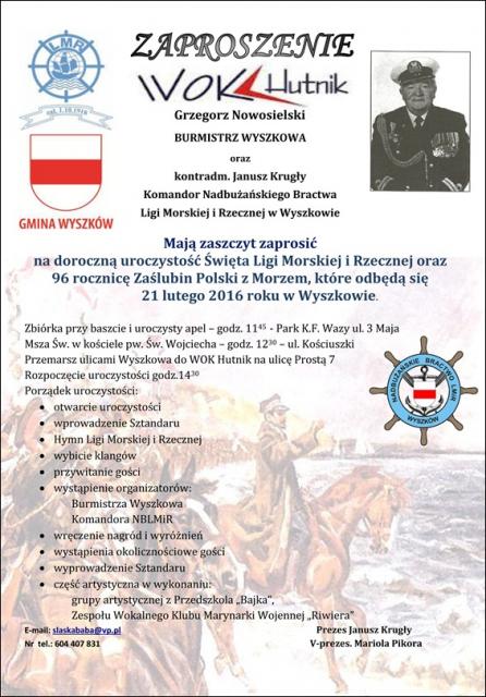 Burmistrz Wyszkowa oraz komandor Nadbużańskiego Bractwa Ligi Morskiej i Rzecznej w Wyszkowie zapraszają na uroczystości 96. rocznicy Zaślubin Polski z Morzem.