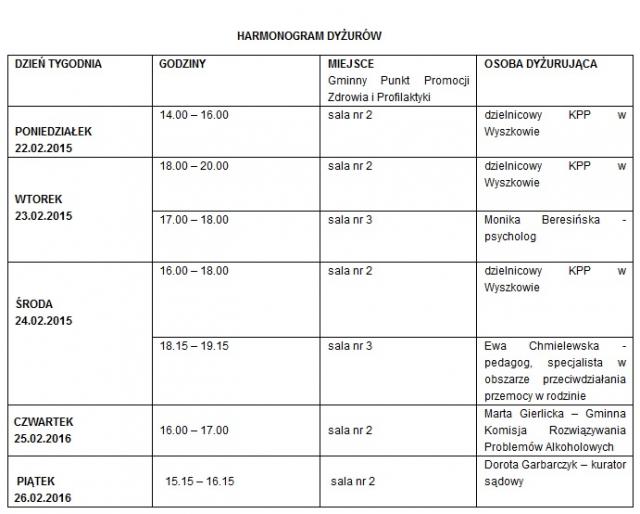 W dniach 22-27 lutego br. w Gminnym Punkcie Promocji Zdrowia i Profilaktyki w Bibliotece Miejskiej w Wyszkowie przy ul. Sowińskiego 80 dyżurować będą przedstawiciele instytucji niosących pomoc osobom poszkodowanym.
