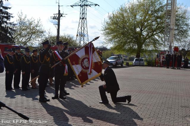 Po odczytaniu decyzji o odwołaniu ze stanowiska Komendanta Powiatowego PSP, st. bryg. Ignacego Woźniaka, komendant pożegnał się ze sztandarem Komendy Powiatowej PSP w Wyszkowie oraz złożył meldunek o zdaniu obowiązków Komendanta Powiatowego PSP.