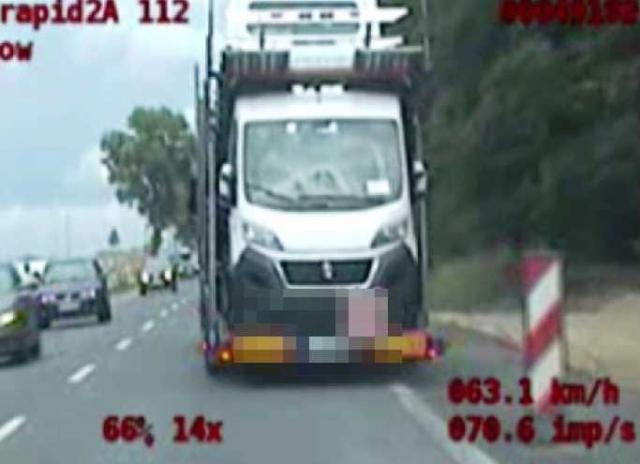 Niebezpieczna jazda kierującego ciężarówką z lawetą pełną aut, została nagrana przez wideorejestrator w policyjnym samochodzie.