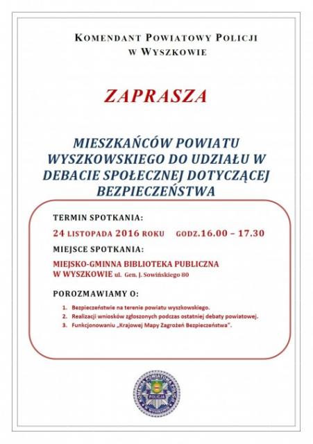Komendant Powiatowy Policji w Wyszkowie zaprasza mieszkańców na debatę społeczną, która odbędzie się dnia 24 listopada 2016 roku w godz. 16.00 - 17.30 w Miejsko - Gminnej Bibliotece Publicznej w Wyszkowie przy ul. Gen. J. Sowińskiego. Podczas spotkanie porozmawiamy o bezpieczeństwie na terenie powiatu wyszkowskiego, realizacji wniosków zgłoszonych przez mieszkańców podczas ostatniej debaty powiatowej oraz o funkcjonowaniu nowego narzędzia jakim jest "Krajowa Mapa Zagrożeń Bezpieczeństwa".