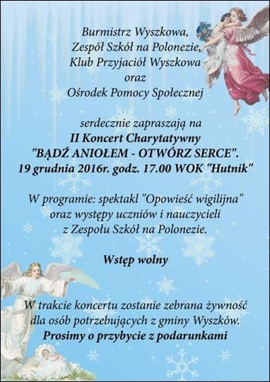 Koncert odbędzie się 19 grudnia o godzinie 17:00 w Hutniku. W programie: spektakl "Opowieść wigilijna" oraz występy uczniów i nauczycieli z Zespołu Szkół na Polonezie.