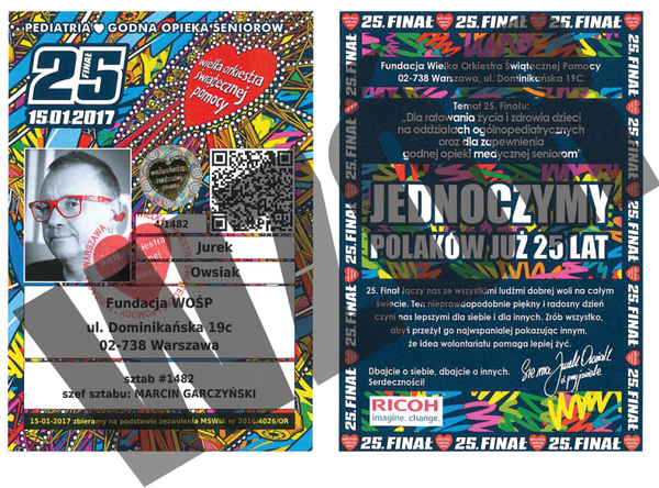 Na identyfikatorze znajduje się imię, nazwisko oraz zdjęcie wolontariusza, numer zbiórki, hologram potwierdzający oryginalność identyfikatora, pieczątka naszej Fundacji oraz kod QR.