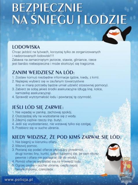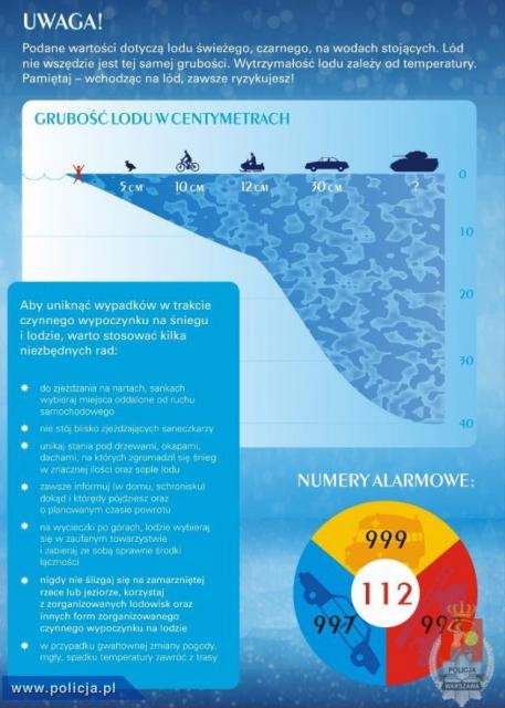 Nieprzemyślane i lekkomyślne korzystanie z uroków zimy może zakończyć się tragicznie. Kontrolujmy, gdzie bawią się nasze dzieci. Uczulmy je na niebezpieczeństwo, jakie niesie ze sobą zabawa na zamarzniętych rzekach, jeziorach czy stawach. Sprawdźmy czy w razie potrzeby będą umiały wezwać pomoc. Uczmy przewidywania i unikania sytuacji zagrażających życiu i zdrowiu.