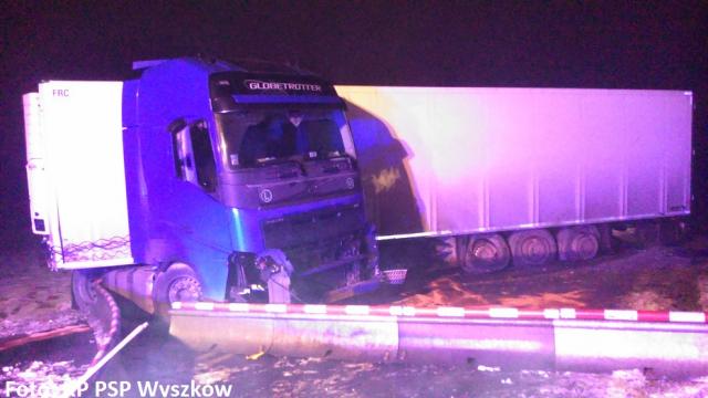 Po dojeździe na miejsce zdarzenia okazało się, iż w wyniku utraty panowania nad pojazdem w poślizg wpadł pojazd ciężarowy taranując barierki zabezpieczające i tym samym całkowicie blokując przejazd drogą krajową nr 8. W zdarzeniu nikt nie dostał obrażeń. Kierowca ciężarówki odmówił interwencji zespołu ratownictwa medycznego.