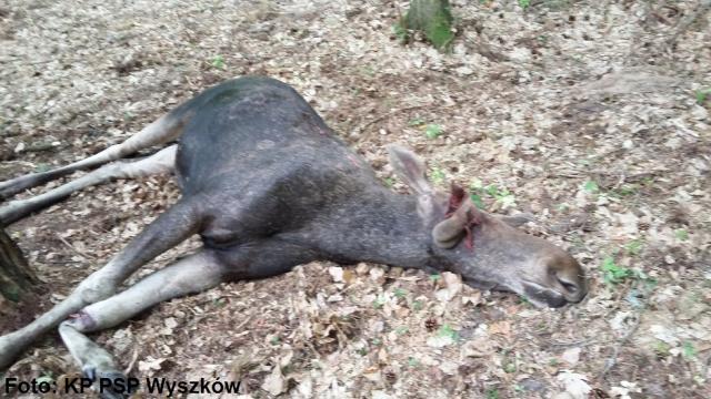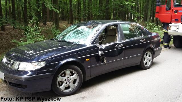 Samochód osobowy marki Saab 95 zderzył się czołowo z przebiegającym przez drogę łosiem. Kierowca trafił do szpitala. Łoś zginął na miejscu.
