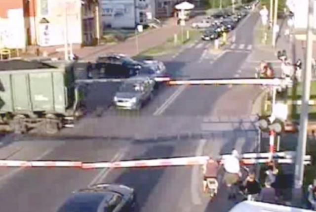Zlekceważył sygnały ostrzegawcze i utknął na przejeździe kolejowym przed nadjeżdżającym pociągiem (zdjęcia, wideo)