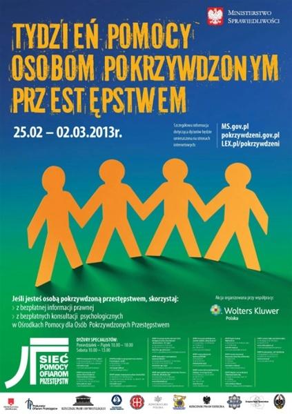 Wojewoda Mazowiecki, Jacek Kozłowski informuję, że wzorem lat ubiegłych Ministerstwo Sprawiedliwości organizuje w dniach 25 lutego - 2 marca 2013 r. "Tydzień Pomocy Osobom Pokrzywdzonym Przestępstwem".