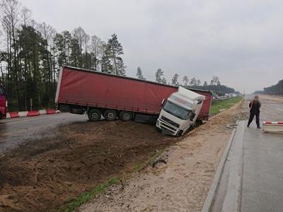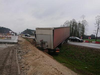 Przedwczoraj po południu na przebudowywanym odcinku drogi K8 w miejscowości Poręba Kocęby doszło do kolizji drogowej. Policjanci pracujący na miejscu zdarzania ustalili, że kierowca samochodu ciężarowego nie dostosował prędkości do warunków panujących na drodze i zjechał do przyrożnego rowu. Na szczęście kierujący nie odniósł żadnych obrażeń. Ze względu na to, że część naczepy zablokowała pas ruchu w kierunku Warszawy przez prawie cztery godziny ruch na tej drodze był utrudniony. Policjanci wprowadzili ruch wahadłowy.
