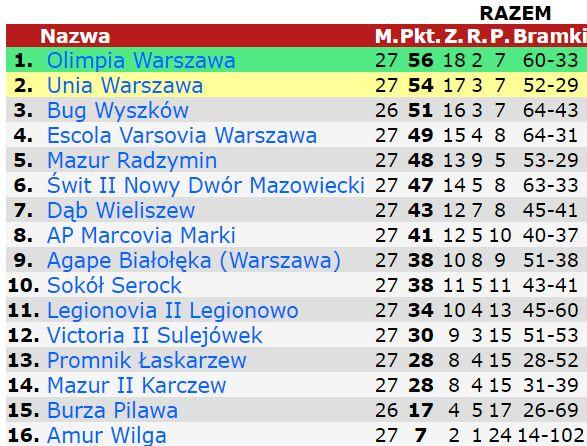 *Tabela nie uwzględnia jeszcze walkower dla Bugu Wyszków.