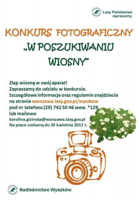 Nadleśnictwo Wyszków organizuje konkurs dotyczący tematu "W poszukiwaniu wiosny", który skierowany jest do dzieci i młodzieży ze szkół podstawowych, gimnazjów i szkół ponadgimnazjalnych położonych w zasięgu terytorialnym Nadleśnictwa Wyszków.