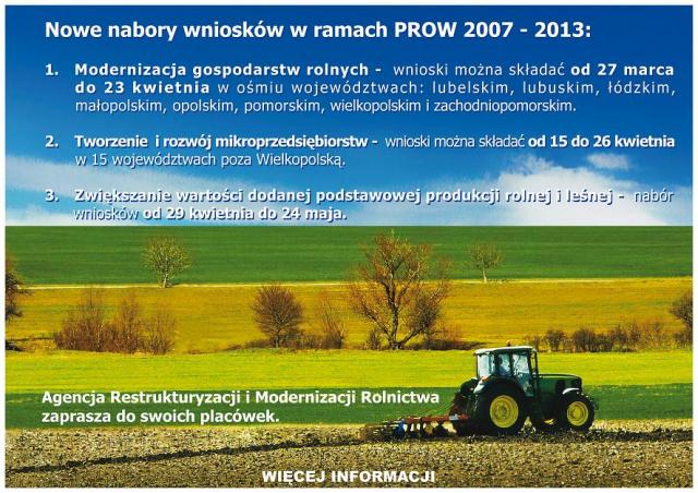 Agencja Restrukturyzacji i Modernizacji Rolnictwa ogłosiła nabór na działanie "Tworzenie i Rozwój Mikroprzedsiębiorstw". Nabór wniosków o przyznanie pomocy w ramach tego działania zostanie przeprowadzony od 15 do 26 kwietnia 2013 r.