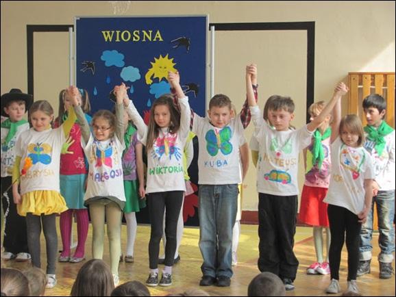 Najpierw miało miejsce spotkanie uczniów klas 0-III, które poprowadziła dyrektor Jolanta Przybysz. W części artystycznej wystąpili kolejno uczniowie biorący udział w projekcie ,,Bawimy się i uczymy, poszerzając horyzonty". Potem można było obejrzeć inscenizację bajki "Kot w butach" oraz podziwiać, zrobione specjalnie na powitanie wiosny, okolicznościowe koszulki.