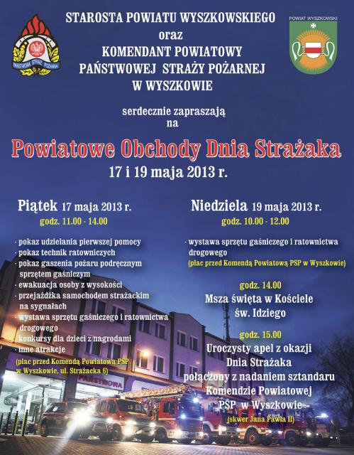 Starosta Powiatu Wyszkowskiego oraz Komendant Straży Pożarnej w Wyszkowie zapraszają na Powiatowe Obchody Dnia Strażaka.