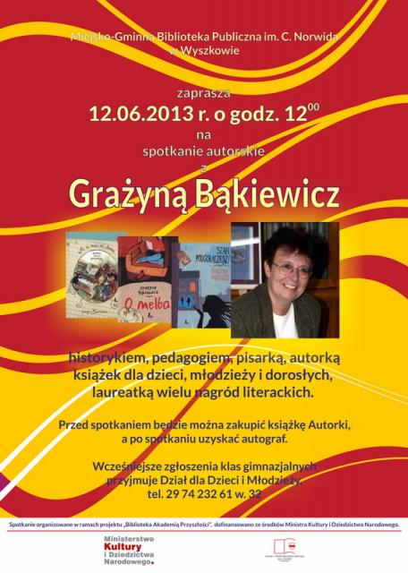 Spotkanie autorskie odbędzie się w środę, 12 czerwca o godzinie 12:00 w Miejsko-Gminnej Bibliotece Publicznej im. C. Norwida w Wyszkowie. Pani Grażyna Bąkiewicz jest pedagogiem, historykiem, autorką książek dla dzieci, młodzieży i dorosłych. Za swoją twórczość otrzymała wiele nagród literackich. Z pod jej pióra wyszły takie tytuły jak "O Melba", "Muchy w butelce" czy "Stan podgorączkowy". Przed spotkaniem będzie można kupić książkę pisarki, a po spotkaniu uzyskać autograf.