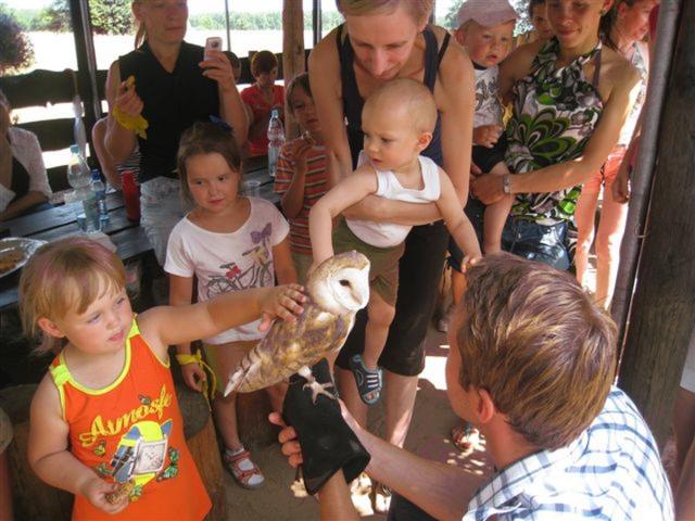 Następnie odbyło się zwiedzanie wiejskiej zagrody, w której dzieci miały możliwość bliżej poznać i nakarmić zwierzęta. W dalszej części spotkania najmłodsi rysowali sowę Płomykówkę, która dzielnie pozowała. Dzieci miały możliwość pomalowania twarzy oraz spędzenia czasu na placu zabaw. Rodzice w tym czasie mogli odpocząć i porozmawiać, napić się kawy lub herbaty.