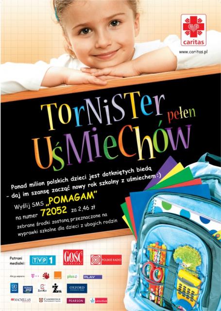 Tegoroczną kampanię Tornister Pełen Uśmiechów wspiera Porozumienie Wydawców Edukacyjnych Nowoczesna Edukacja. Wydawnictwa: WSiP, Nowa Era, Oxford, Pearson, Macmillan, Żak, Zamkor, Cambridge i Lektorklett za pośrednictwem Caritas bezpłatnie przekazują swoje podręczniki dzieciom. - Zdajemy sobie sprawę, że dla rodzin wielodzietnych i znajdujących się w trudnej sytuacji materialnej zakup podręczników może być dużym wydatkiem. Dlatego od wielu lat poszczególne wydawnictwa przekazują we własnym zakresie podręczniki najbardziej potrzebującym. Współpraca z Caritas daje nam szansę na skoordynowanie naszych działań i dotarcie z pomocą tam, gdzie jest najbardziej potrzebna - mówi Witold Szczęsny, reprezentujący Porozumienie Nowoczesna Edukacja.