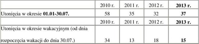 (W uzupełnieniu powyższych danych obejmujących okres 01.01. - 30.07. 2013r. - w dniach 31 lipca br. utonął mężczyzna na terenie powiatu lipskiego, w dniu 3 sierpnia br. utonął mężczyzna na terenie powiatu szydłowieckiego. Stąd ogólna liczba utonięć w 2013 to 39 osób).
