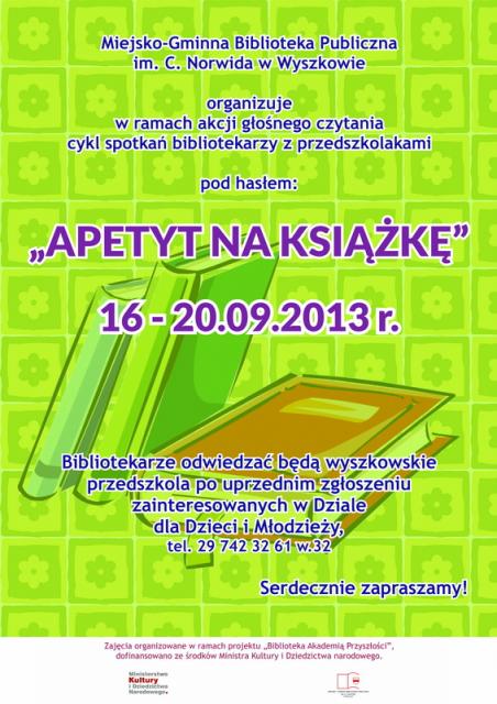 Wyszkowska Biblioteka zaprasza na cykl spotkań "Apetyt na książkę", który jest organizowany w ramach akcji głośnego czytania.