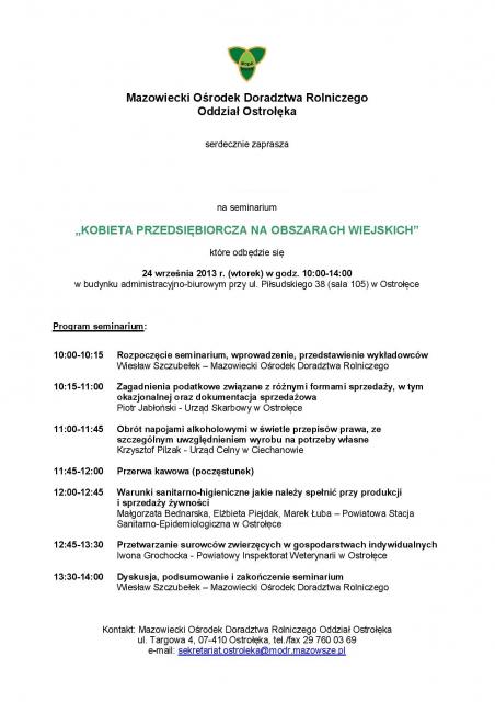 Mazowiecki Ośrodek Doradztwa Rolniczego Oddział Ostrołęka oraz Sekretariat Regionalny KSOW w Województwie Mazowieckim serdecznie zapraszają na bezpłatne seminarium "Kobieta przedsiębiorcza na obszarach wiejskich".